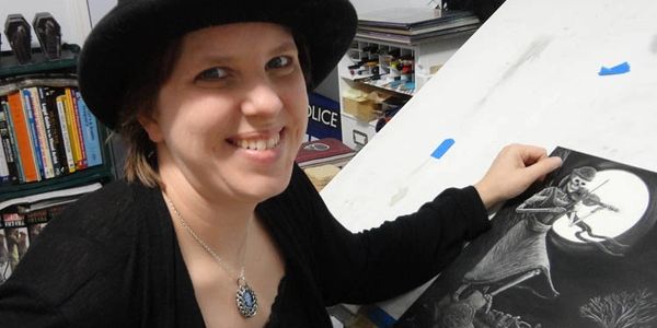 As a scratch board artist Heather Schilling draws with a knife. Using an exacto knife she scratches out whimsical and macabre illustrations for those who enjoy Halloween and everything in the shadows of the world. Her creations include a variety of skeletons, grim reapers, zombies, bats, pumpkin people and other creatures. There is also an adventurous little girl who loves Halloween and hates snowmen.